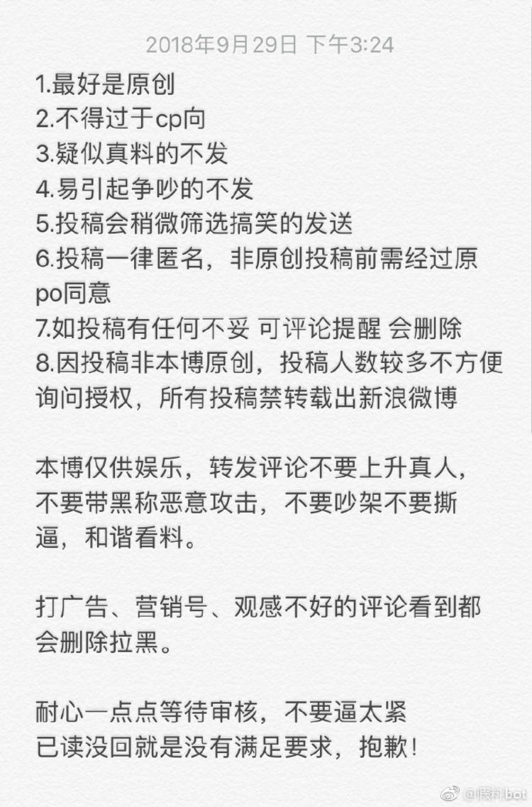 假料 bot 和意难平 bot 还定下了看起来挺严格的投稿要求。
