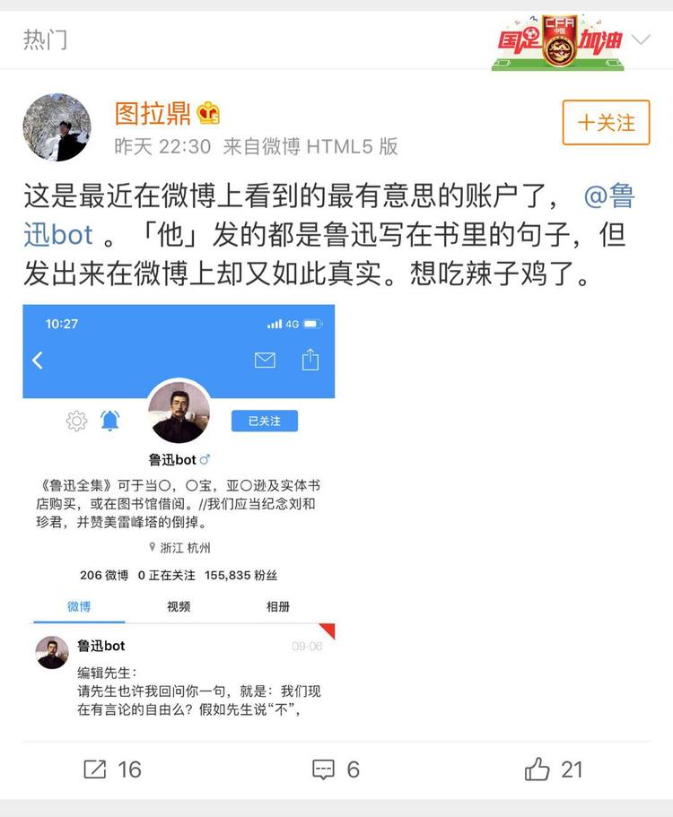 失恋 bot 、意难平 bot 和鲁迅 bot 走的是语录分享型。失恋 bot 和意难平 bot 每天会发好多从书籍、影视、歌曲、二次元作品里摘录的伤情片段。鲁迅 bot 就更好理解了,都是鲁迅著作中的话语,嗯,真的都是鲁迅说的那种。