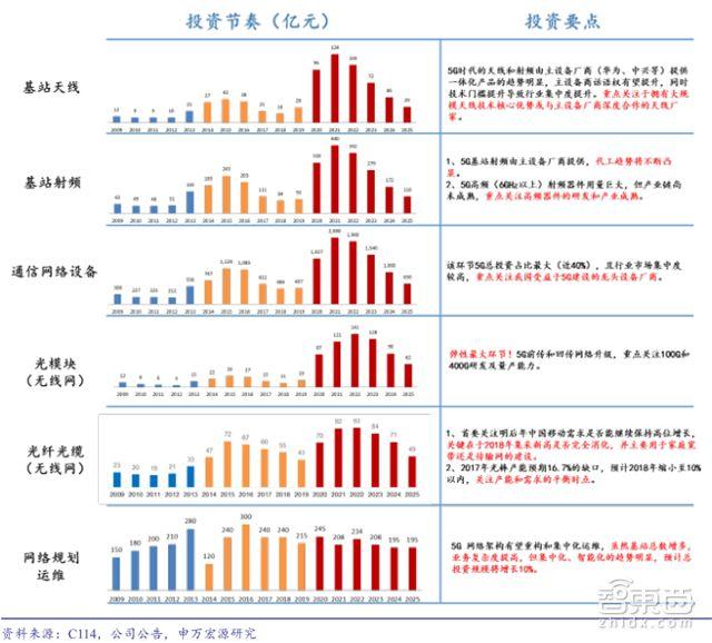 5G产业链包括天线、射频、通信设备、光模块、光纤光缆和网络运维等多个环节。基于我国三大运营商的建网规模与节奏,申万宏源对各产业环节的投资规模与节奏进行了详细测算。