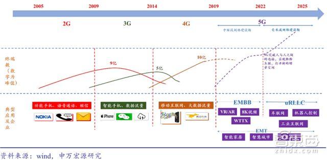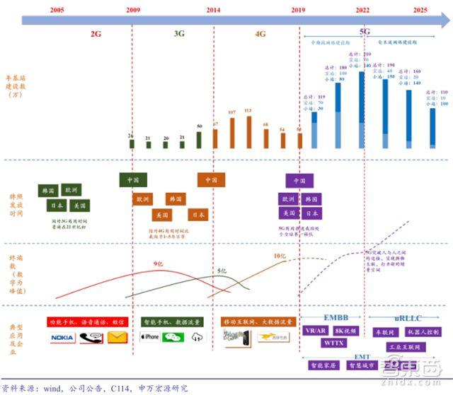 基于上述关键因素, 申万宏源从基站建设规模、用户发展、推进节奏、应用场景等维度对5G生命周期进行全面解构。