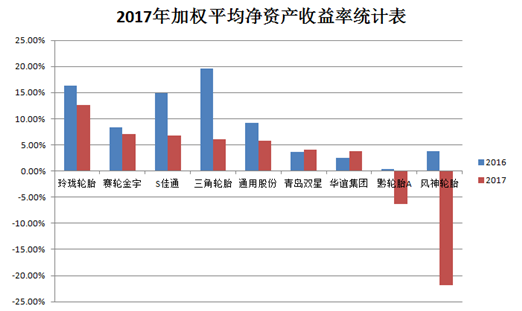 与2016年相比,2017年,中国上市轮胎公司净资产收益率呈整体下滑趋势。