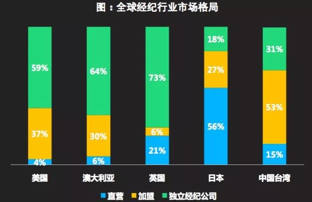 这恐怕是在欧美发达国家,经纪公司的加盟比例居于高位的原因之一。在美国,经纪公司的直营比例不到4%,不少个人经纪人或者独立经纪公司通过加盟模式挂靠经纪公司;在澳大利亚,直营比例为6%,英国为欧美最高,达到21%。而即便是和中国大陆市场相类似的台湾地区,直营比例也仅占15%。