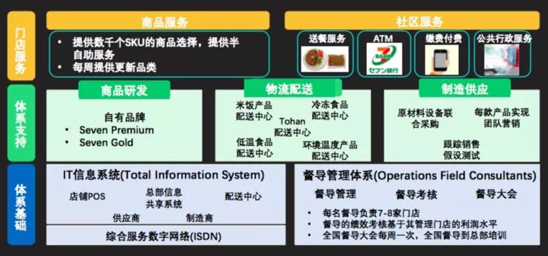 7-11是零售行业的先锋。在提供给用户便利性的背后,是其提供给加盟商包括IT、督导、配送供应在内的一套完备的基础设施体系,来保证供应的有序运营。