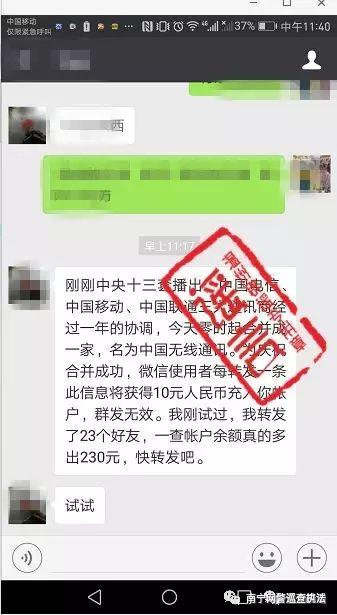 有网民发消息称:刚刚中央十三套播出,中国电信、中国移动、中国联通三大通讯商经过一年的协调,今天零时起合并成一家,名为中国无线通讯。为庆祝合并成功,微信使用者每转发一条此信息将获得10元人民币充入你账户,群发无效。我刚试过,我转发了23个好友,一查账户余额真的多出230元,快转发吧。