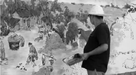 第三、放稿,着色。放稿,即按照草图所勾勒的样式,将画作的形态放大勾勒到墙面上,在此阶段,也是能够做到越细越好,包括人物的形体比例及神态等,动植物的生长方式,形态等等;着色,根据不同物态的特征,从局部着色,切忌遍地开花,为了节省颜料,调一笔红色,就把所有红色都画一遍,而忽视了色彩之间的差异性,而导致画面呆板。