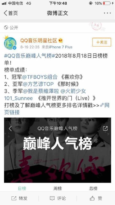 他和sunnee合唱的《推开世界的门》,现场唱得很稳,后来还登上了QQ音乐巅峰人气榜季军。