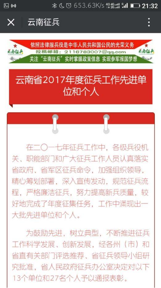 近日,云南省人民政府征兵办公室下发文件,分别授予昭通市人民政府征兵办公室和昭通卫生职业学院“2017年征兵工作先进单位”荣誉称号。据悉,全省获此荣誉的共有13家单位,其中昭通市有2家。