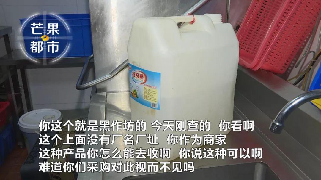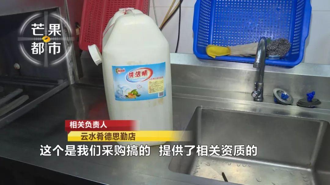 接着,长沙雨花区食药监局的执法人员来到长沙德思勤商业中心的云水肴饭店进行突击检查,在饭店后厨内,执法人员发现,该店用的洗洁精正是这款市面上并不存在的“亮丽牌”洗洁精。