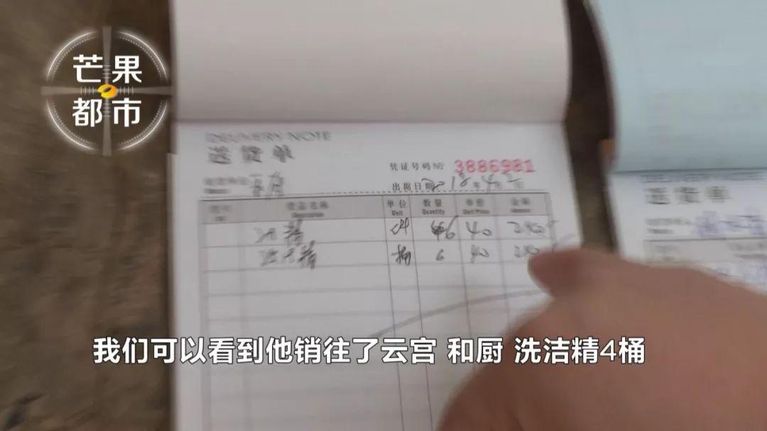 在调查期间,这家洗洁精生产厂的老板自称生意十分火爆,货路遍及长沙各大餐馆。接着,记者在一旁送货车上,发现了该作坊的送货单据。
