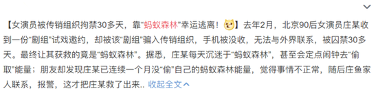 上个月,蚂蚁森林更是立功!一女演员陷入传销策划,手机被没收,无法与外界联系。最终,其朋友发现女演员一月之内没有在蚂蚁森林偷过自己能量,也没有收过自己能量。判断事情不正常,最终报警,女演员中最获救。