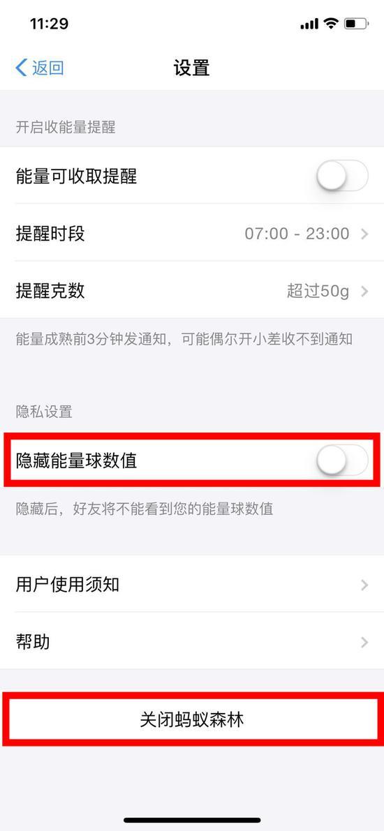 有用户肯定会问?有什么办法能避免这些呢?答案也很简单,我们只需在设置中打开“隐藏能球量数值”即可。如果仍然担心自己信息泄露的话,可以点击关闭蚂蚁森林即可,关闭后可根据需要重新开通使用。