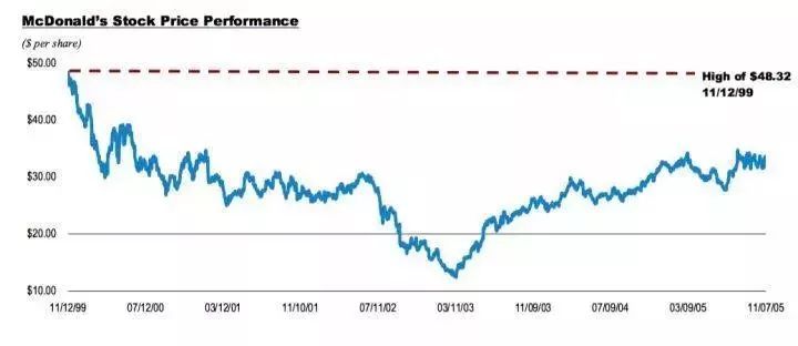 当时麦当劳刚刚走出低谷期,同店增长艰巨转正,利润率慢慢回升。股价从巅峰期的 48 美金跌到了 2005 年的 30 美金上下。