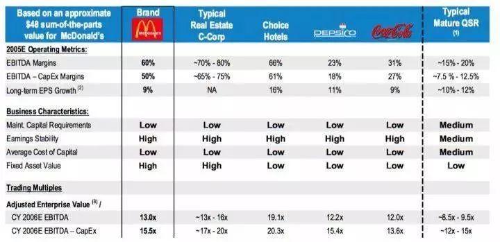 拿 EV/EBITDA 来看,地产公司估值是 13 ~ 16 倍,品牌估值是 12 ~ 15 倍,而快餐行业的估值只有 8.5 ~ 9.5 倍。当他建仓时,麦当劳估值为 8.7 倍,也就是一个快餐公司的估值。