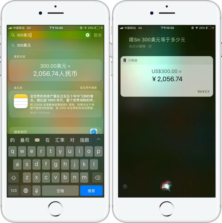 苹果自带有汇率转换工具。在通知中心搜索栏输入要转换的金额,比如 “300 美元”、“4000 欧元”,搜索结果会自动弹出对应的人民币价格。如果不想动手指,也可以启用 Siri,问它 :“300 美元等于多少元”、“4000 欧元等于多少元”,Siri 会直接报出人民币价格。