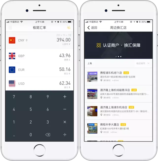 极简汇率(iPhone|Android 手机)也是一样不错的汇率转换应用。界面可以同时显示四种货币汇率,并且可以根据所在地位置,将当地币种放到顶端;计算器部分不仅是简单的加减乘除,还具备隐藏式的括号功能(长按 × 或是 ÷ 号),方便多件商品一起计算折扣价。
