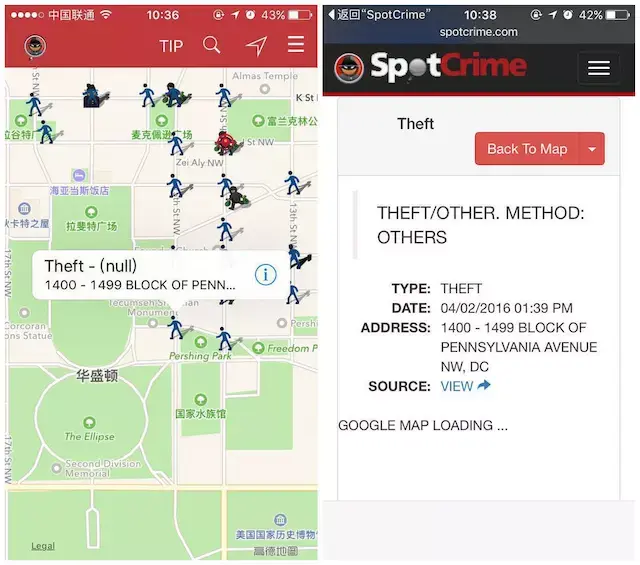 以美国为例,SpotCrime ( iPhone ) 这样的安全地图可以帮你避开犯罪高发的街区。