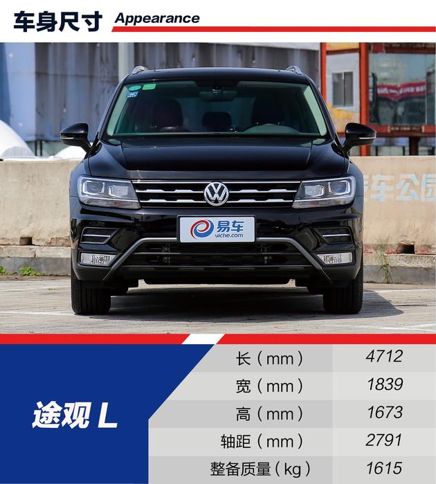 首先平衡的就是车身尺寸,途观L的尺寸为4712x1839x1673mm,轴距2791mm,在同级别中也属于中等的水平。
