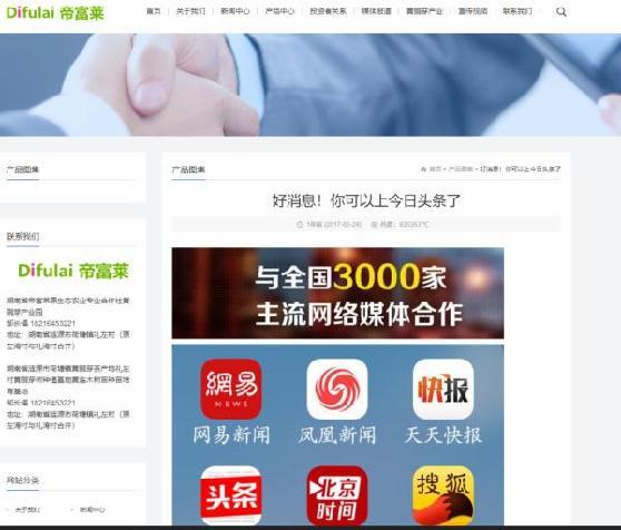 2017年5月,湖南省帝富莱原生态农业专业合作社网站也曾发布一篇名为“好消息!你可以上*今条头日**了”的文章称,“(可以)为企业提供各种形式的新闻报道,发布在权威的网络媒体上,提高公众对企业产品或服务的认知度,塑造良好品牌形象,并提高销售转化率的营销服务。”
