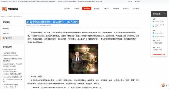 一家名为“中国媒婆网”的软文代发平台标注的联系方式与实名认证微博“湘军部落邹志斌”、湖南省帝富莱原生态农业专业合作社备注的邹志斌的联系方式为同一手机号。而“中国媒婆网”上就有一篇名为“史润龙谈梦想实录:登大舞台,成大事业”的文章,被放在了该网站“客户案例学习”栏目。