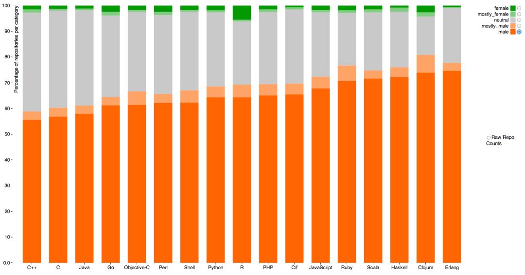 GitHub repo 按照语言划分的男女用户比例,最上面的绿色是确认的女用户(2014 年数据)