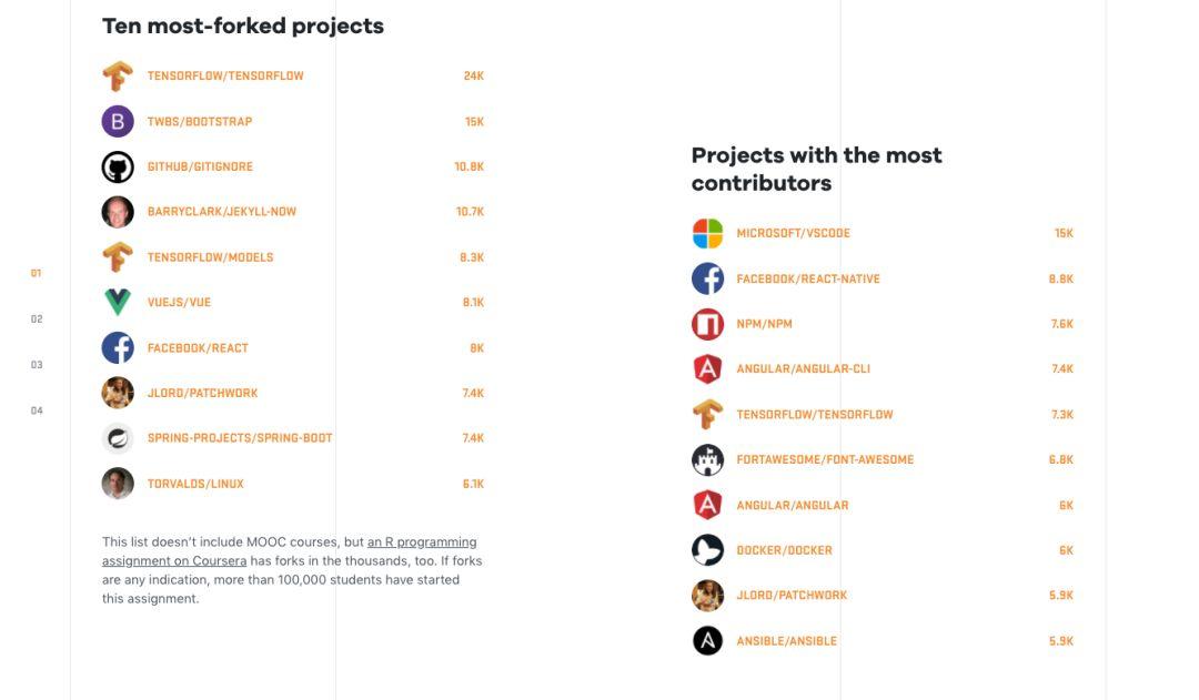 fork 最多的项目,TF、Bootstrap、gitignore;贡献者最多的项目,VSCode、React Native、NPM: