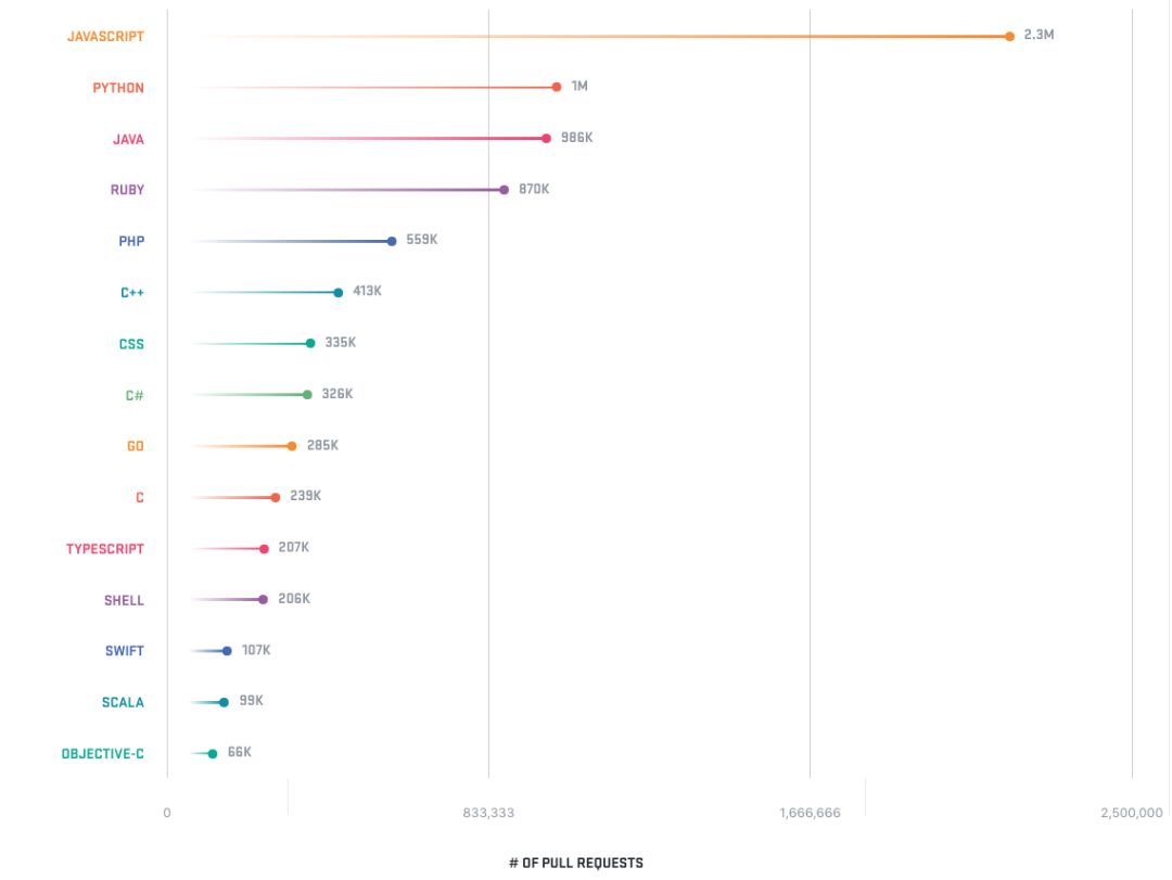 最后,给一些 GitHub 整顿的资料。首先,按照 PR 统计的受欢迎语言,JS、Python、Java、Ruby、PHP: