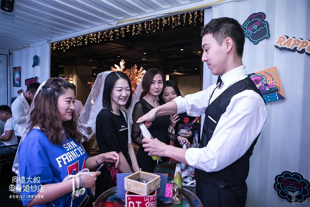 所以,如果要再度实现差异化,所谓的体验需要再度升级。同道大叔的单身婚纱店从创意到形式都充满了有趣与独特,比如与泸州老窖合作的所谓“百调星座预调酒酒”亮相“酒吧区”,花作提供的魔法花茶…….各种沉浸式现场体验,惊喜彩蛋占领眼球。
